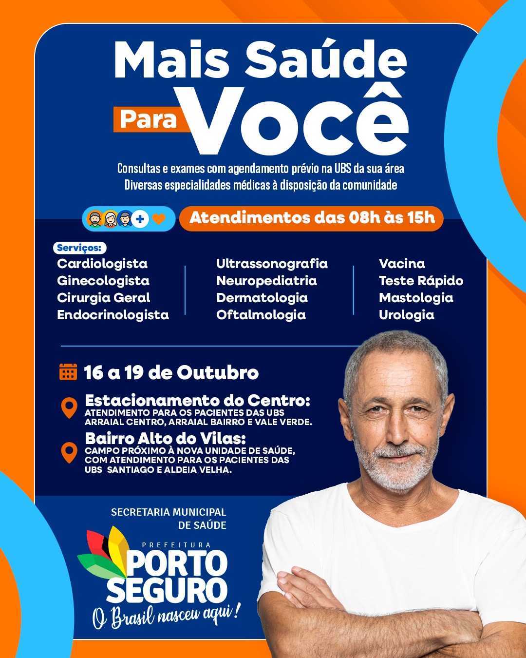 A Prefeitura de Porto Seguro, por meio da Secretaria Municipal de Saúde, promove entre os dias 16 e 19 de outubro a 4ª edição do programa Mais Saúde Para Você, desta vez no distrito de Arraial d’Ajuda.
