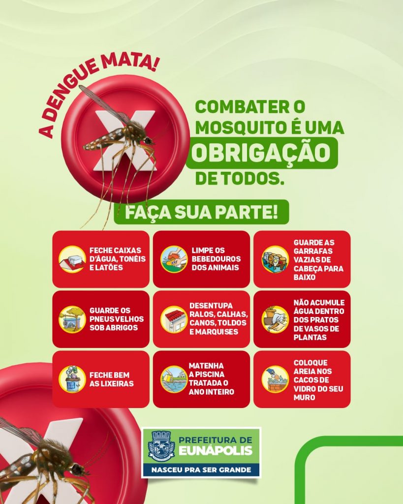A secretária de Saúde, Pâmela Dadalto, frisou a importância da prevenção. “Não podemos deixar que o número de casos de doenças transmitidas pelo mosquito aumentem no nosso município, e só a prevenção é capaz de frear a proliferação do Aedes Aegypt. Então, solicitamos a todos os eunapolitanos que sigam as nossas orientações e elimine qualquer foco de água parada”, alertou.