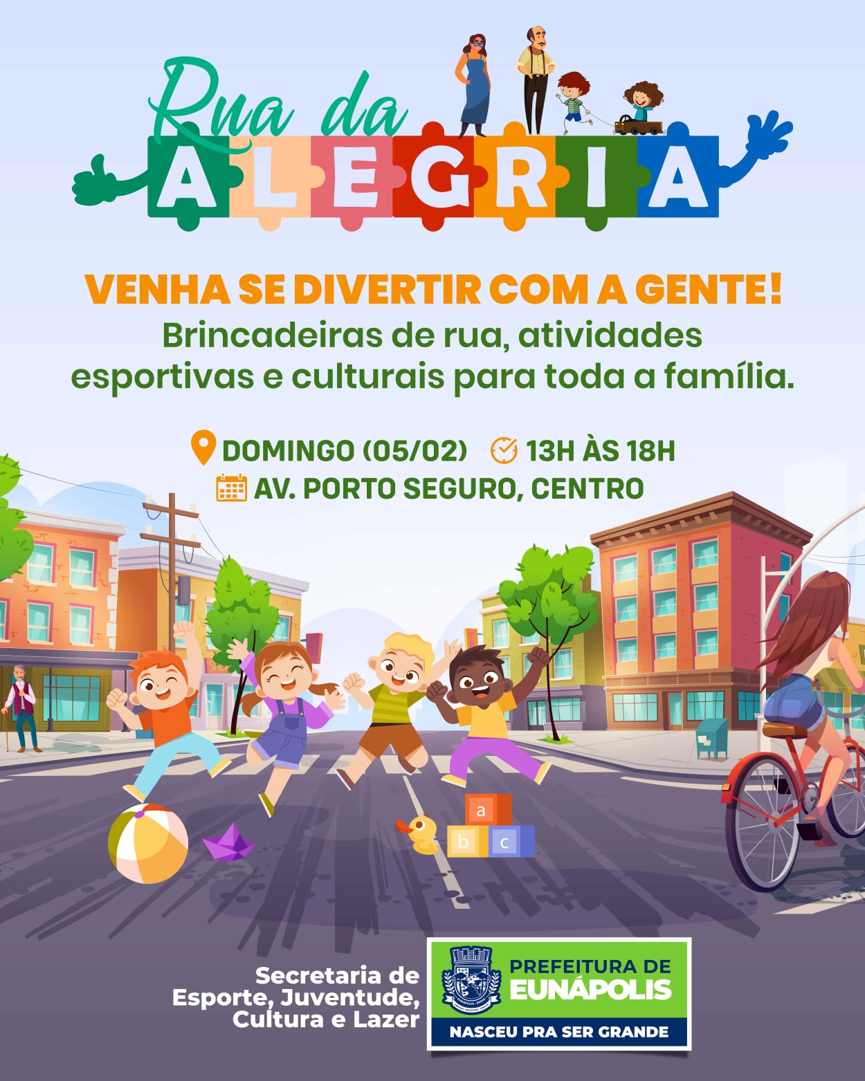 A “Rua da Alegria” será realizada frequentemente pela Prefeitura de Eunápolis em alternadas vias públicas com programações voltadas às práticas de diversas atividades.