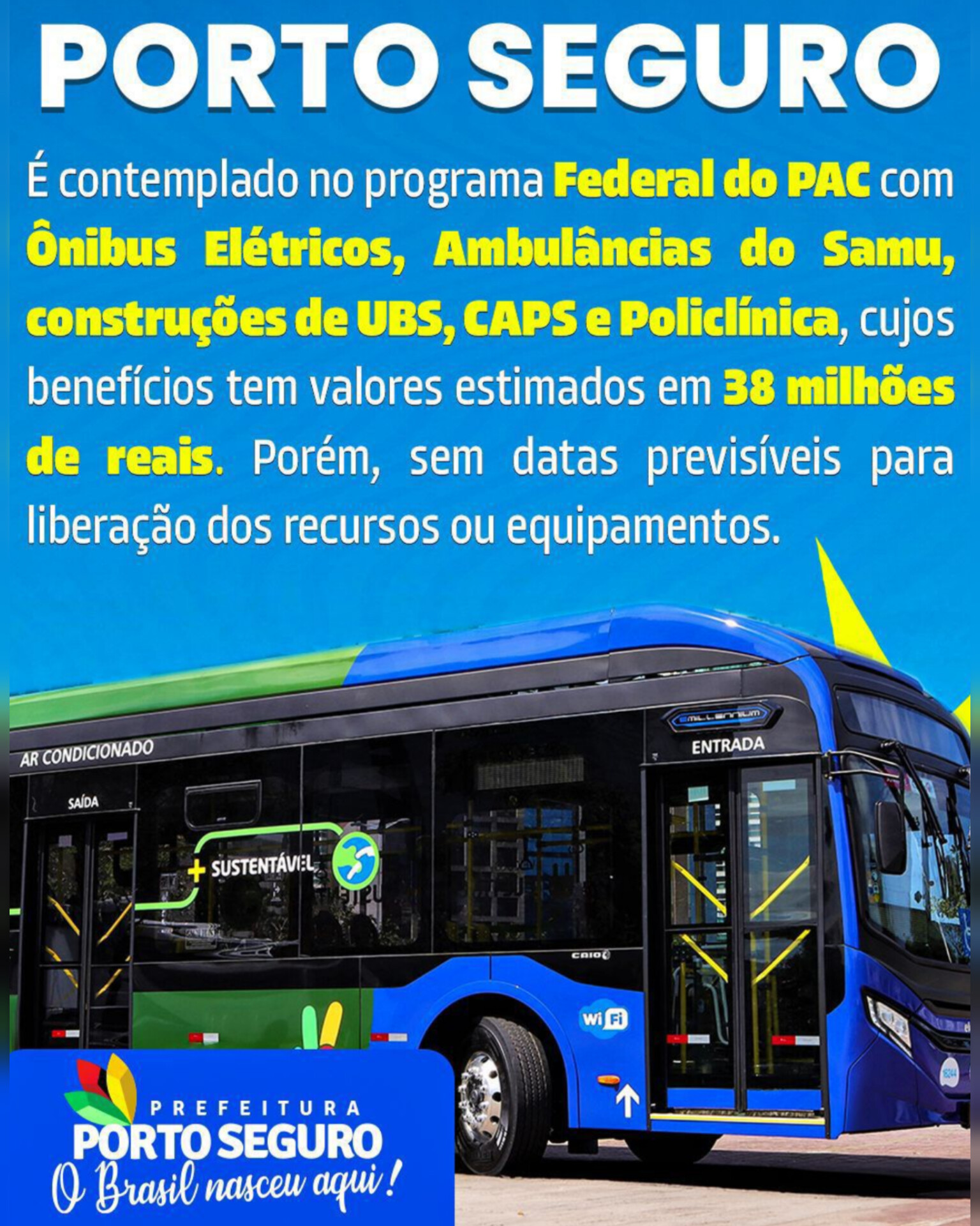 Porto Seguro foi contemplado pelo Governo Federal no novo pacote de investimentos do Programa de Aceleração do Crescimento (PAC), garantindo ao município importantes obras e equipamentos voltados à saúde e mobilidade. Entre as iniciativas previstas estão ônibus para o transporte público, novas ambulâncias do Samu, além da construção de Unidades Básicas de Saúde (UBS), Centros de Atenção Psicossocial (Caps) e uma Policlínica.