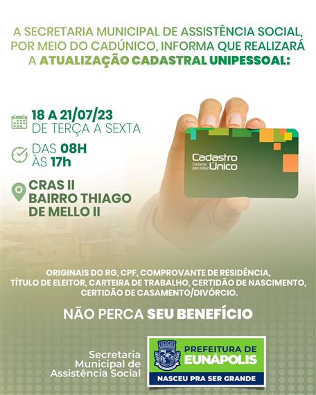 Prefeitura de Eunápolis, por meio da Secretaria Municipal de Assistência Social, anuncia a segunda etapa da atualização cadastral unipessoal, com o objetivo de garantir a manutenção dos benefícios sociais oferecidos pela administração municipal. Os cidadãos têm a oportunidade de regularizar seus dados de terça-feira (18) a sexta-feira (21), no horário das 8h às 17h, no Centro de Referência de Assistência Social II (CRAS II), localizado no bairro Alecrim II.