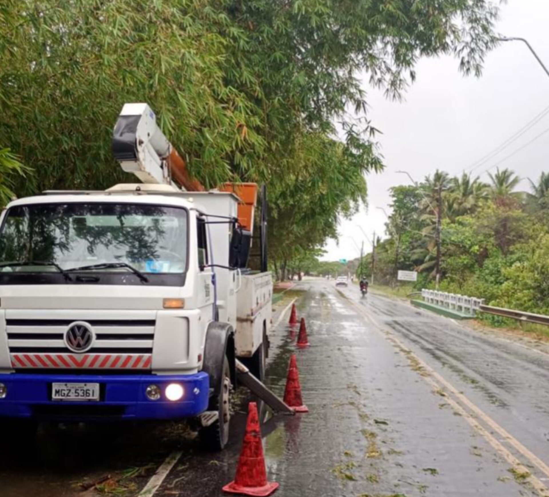 Em sistema de mutirão, as equipes atuaram na retirada de árvores, postes e placas caídos, além da limpeza de vias e apoio às áreas afetadas. O trabalho foi feito com máquinas e homens e se concentrou principalmente na Orla Norte, Centro, Frei Calixto e Arraial d’Ajuda, mas também chegou a outras localidades.
